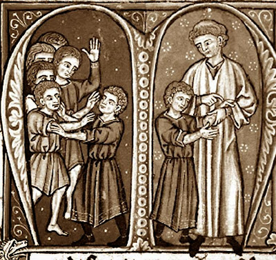 El obispo y cronista Guillermo de Tiro descubre que Balduino padece la lepra (reproducción de un grabado de “L'Estoire d'Eracles” (Francia, años 1250. Biblioteca Británica, Londres)