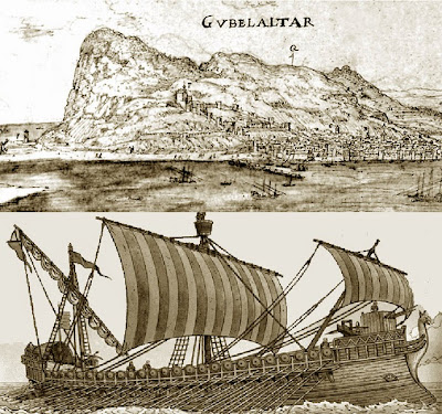 Grabado de Gibraltar del siglo XVI y reproducción de un dromon bizantino, posiblemente el tipo de barco que utilizaron para cruzar el estrecho