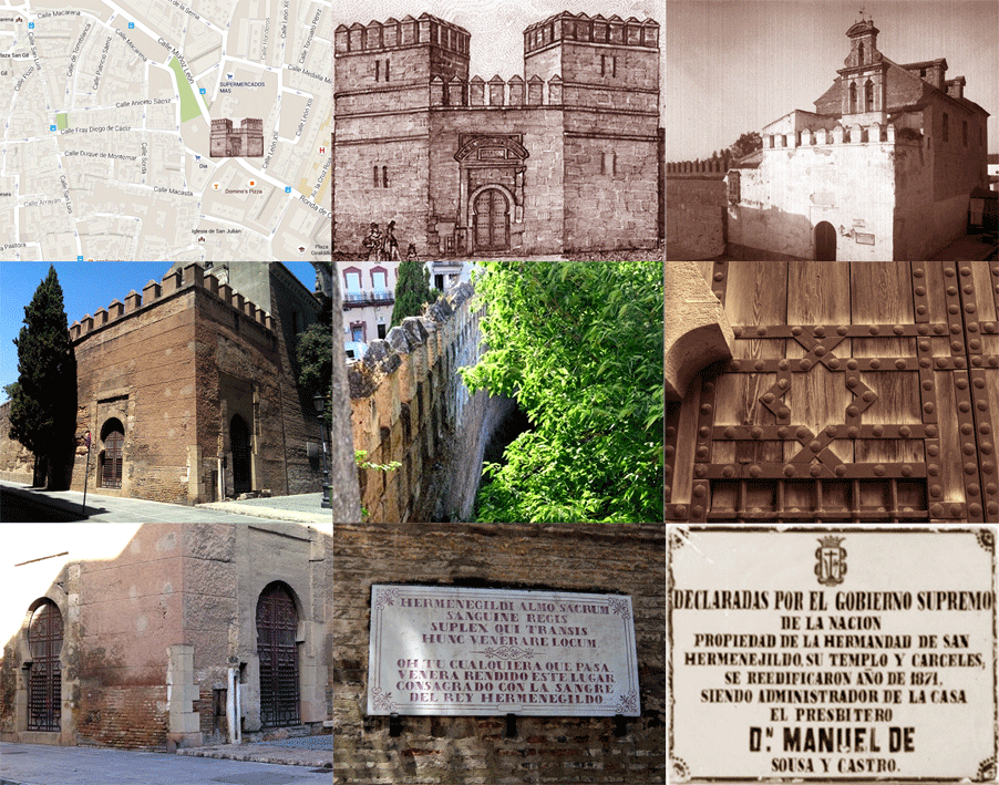 Su estructura como torre-puerta con acceso en recodo único y protegido por barbacana, posiblemente de origen almohade, fue modificada en las obras de reforma emprendidas de 1560 y quedó, según el grabado de Tovar que se conoce, con doble torre y puerta central siguiendo las directrices de Hernán Ruiz (el Joven) autor del informe sobre las reformas de las puertas emitido en 1560. Cuando en 1867 se inicia el derribo del tramo de muralla comprendido entre la Puerta de Córdoba y la Puerta de Sol, la intervención de la Comisión Provincial de Monumentos paralizó el mismo durante algo más de un año. En 1869 esta torre-puerta sería demolida parcialmente, según el cronista Félix González de León, el buen estado de conservación de parte de ella evitó su derribo total, más el hecho de existiera en ella una capilla en honor a aquel príncipe visigodo, Hermenegildo, quien al convertirse al catolicismo y autoproclamarse rey de Sevilla despertó las iras de su padre, Leovigildo, lo que significó el cerco de la ciudad y tras su rendición, según la tradición, fue en esta torre donde permaneció detenido, torturado y decapitado. Algo que históricamente no pudo ocurrir pues la construcción de esta torre es de algunos siglos después (ver nuestra entrada del 3 de noviembre de 2014: Cuando el pasado se hace presente (5)). Fue, por tanto, también la tradición lo que evitó la demolición total de la torre-puerta del siglo XVI y el haber sido asignada su propiedad a la Hermandad de San Hermenegildo, fundada en 1248 y quienes habían erigido en su interior una capilla en su honor y memoria. Dadas sus limitaciones, entre 1607 y 1616 se edificó la iglesia de San Hermenegildo a la que se encuentra adosada y que hoy se puede contemplar, siendo la puerta de esta torre el acceso al interior del templo. Propiedad que es atestiguada por el descubrimiento, hace dos años de un pequeño azulejo en el templo en que se puede leer: “Declaradas por el Gobierno Supremo – de la Nación – propiedad de la Hermandad de San – Hermenegildo, su templo y cárceles; - se reedificaron año de 1871, - siendo administrador de la casa – el Presbítero – D. Manuel de – Sousa y Castro”, según recoge el historiador d. José Gestoso y Pérez en su obra Sevilla monumental y artística (1899-1902). Se cree que fue en 1569 cuando se colocó una lápida con una inscripción en latín y español en la que se hace referencia al martirio de San Hermenegildo. Por documentos iconográficos se sabe que aquella lápida, a mitad del siglo XIX, estaba colocada sobre el arco de la puerta, hoy en día puede observarse en la fachada principal de la iglesia.